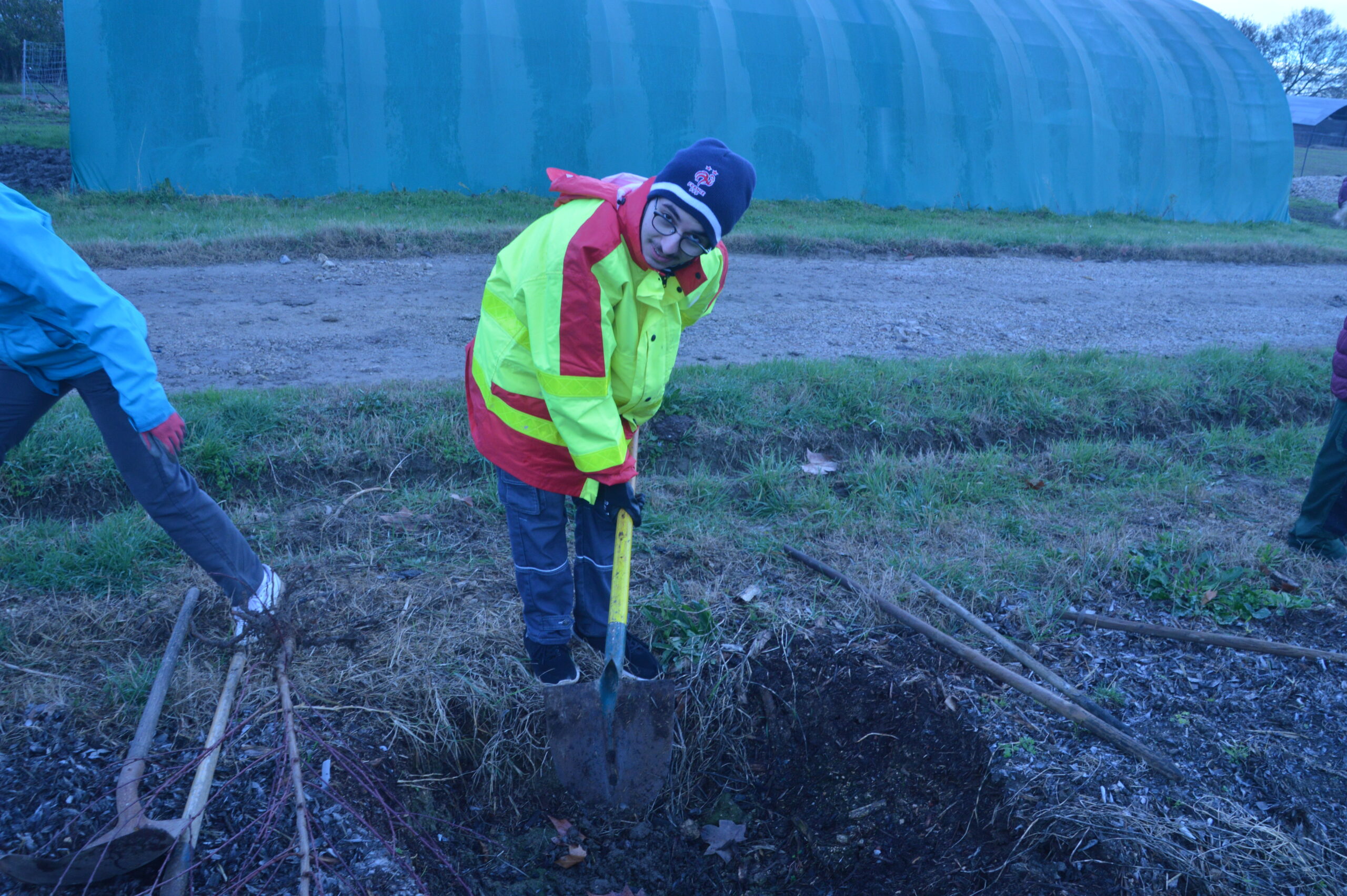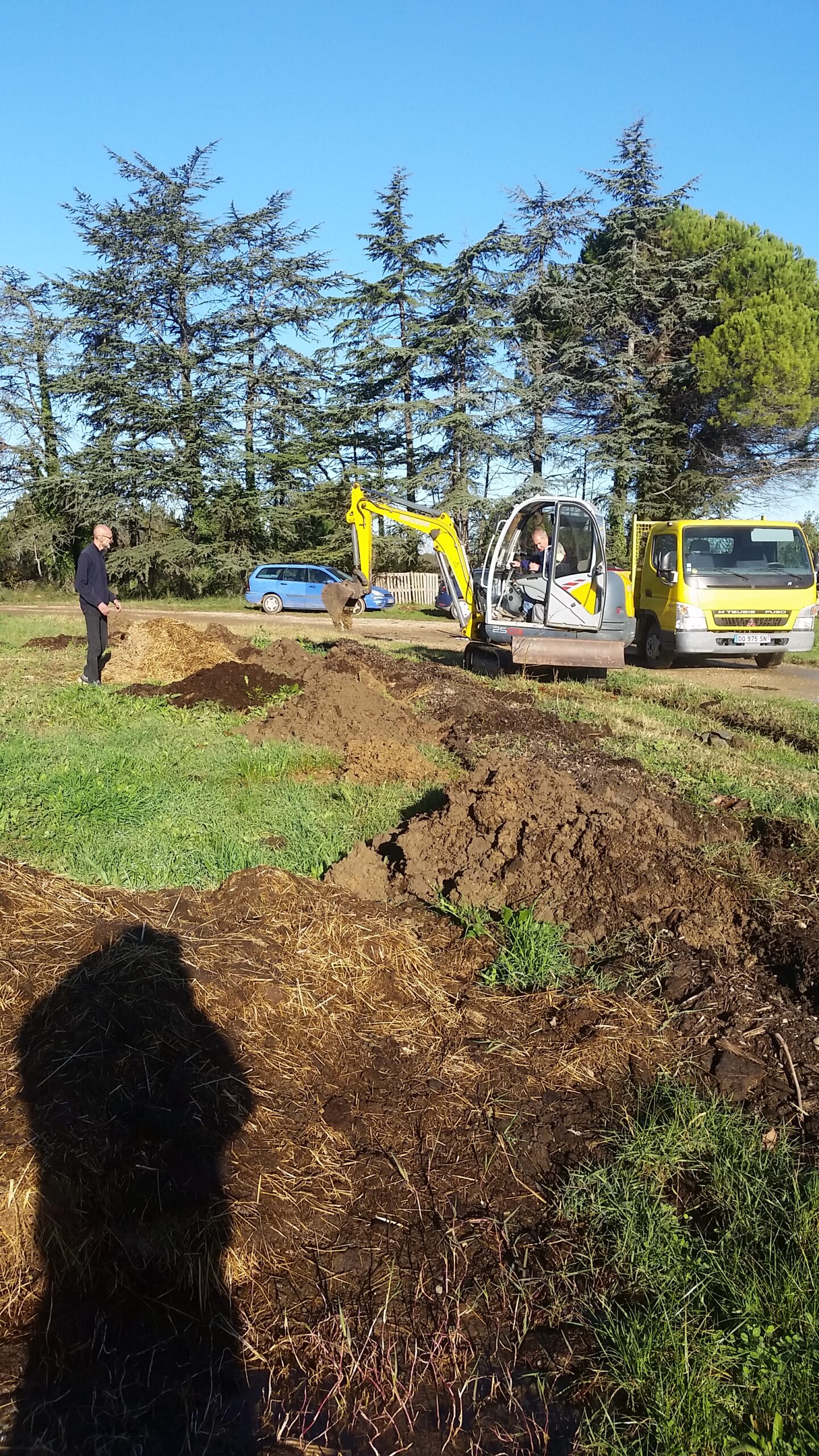 Fin novembre, nous creusons les trous, une fois n’est pas coutume, à la pelle mécanique! Nous y jetons deux poignées d’un super terreau de leur cru avant de partir en vacances pour les fêtes de fin d’année.
